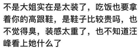 “不是大姐实在是太装了,吃饭也要拿着你的高跟鞋,是鞋子比较贵吗,也不觉得臭,装感太重了,也不知道汪峰看上她什么了。”