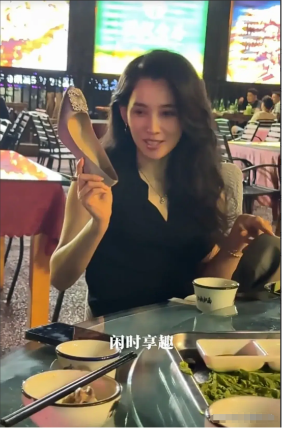 我们从图片中可以看到,在饭桌上的时候,她拿着一个高跟鞋,不知道这个高跟鞋是不是她自己的,似乎是她出门穿的那一个,单是从这双高跟鞋的外表上来看,价格应该就不低。