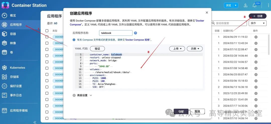 如果你使用群晖或威联通,可以使用内置的Docker套件直接部署,方法也很简单,将1️⃣中的内容复制下来,然后打开套件,新建应用程序,将复制的内容粘贴进去,启动即可。
