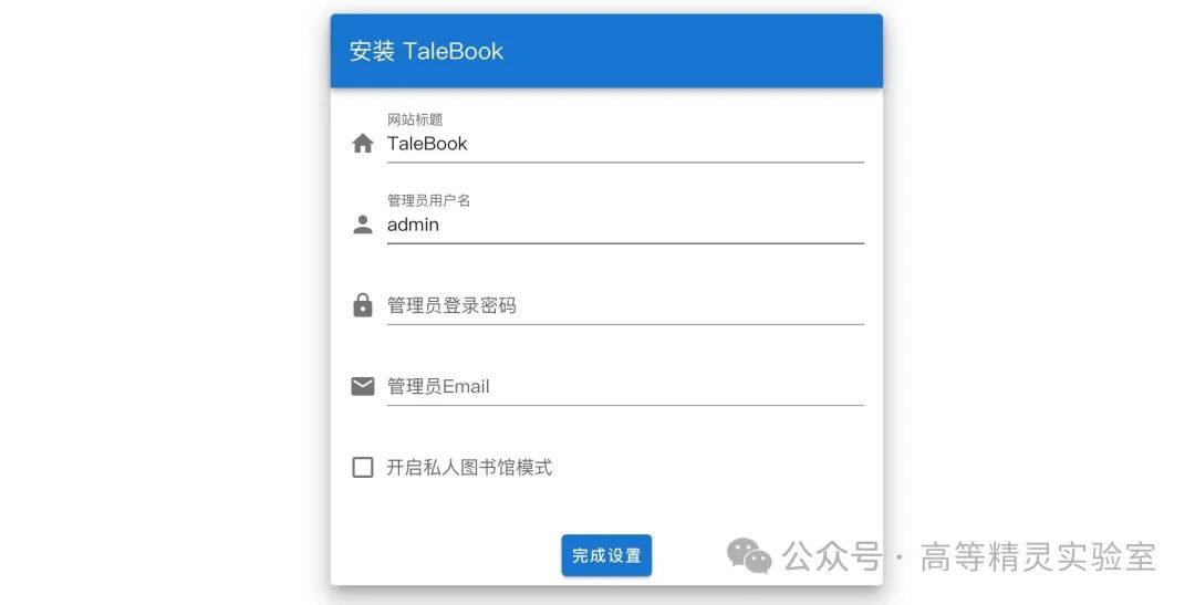 首次进入系统后需要先进行一些基本设置,包括站点的标题,是否开启私人模式,管理员的用户名、密码和邮箱。