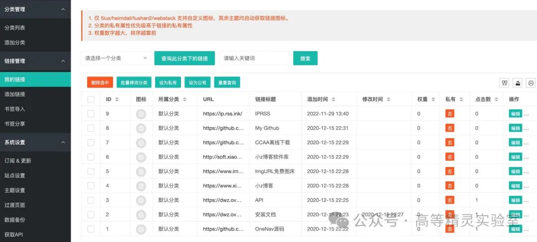 上面介绍的主要是后台管理界面,在后台添加好的书签或链接,将展示在前台网页上。登录用户也可以直接在前台网页上对链接进行管理。