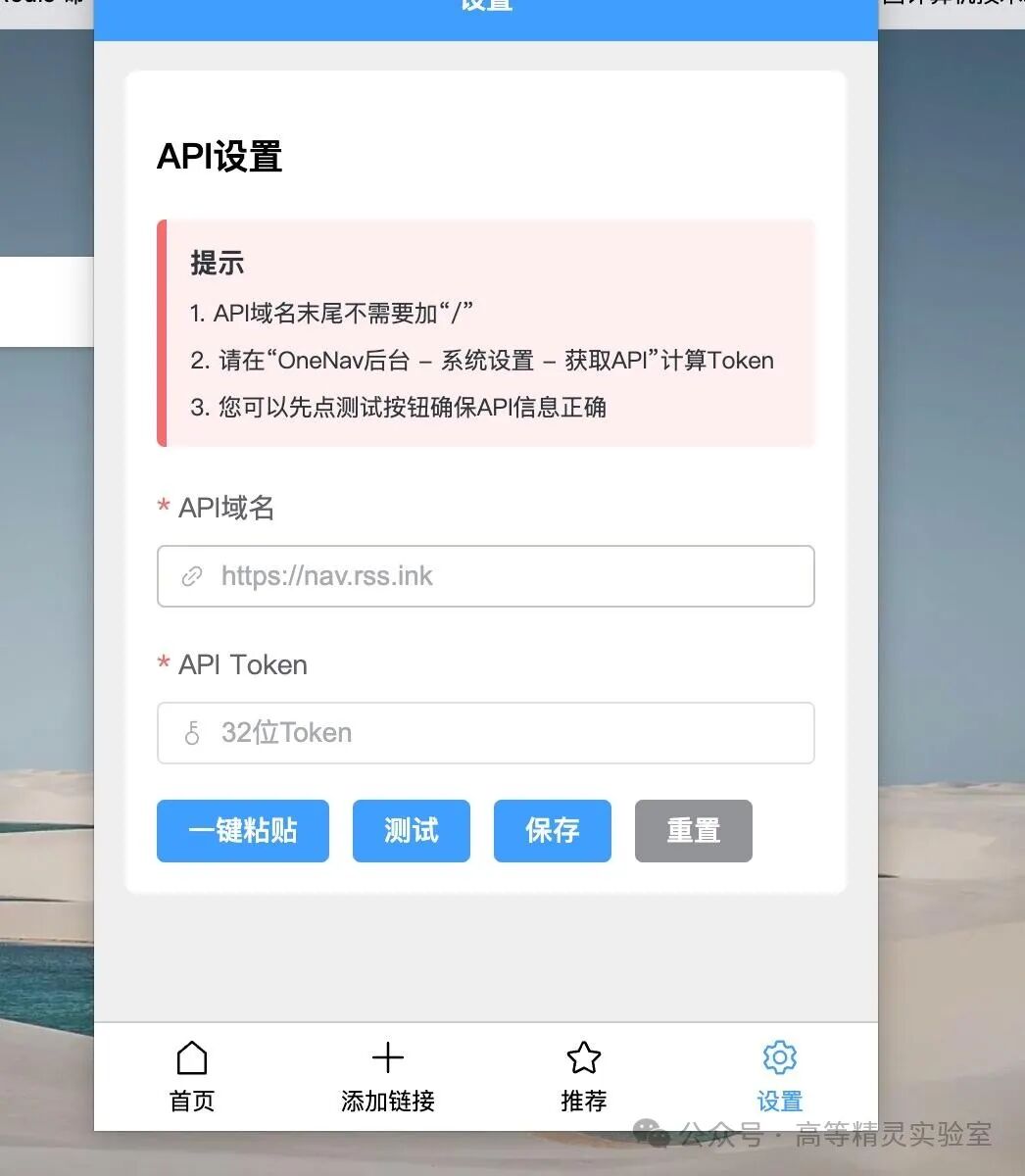 然后在插件中填写你的OneNav地址和Token,测试无误后保存。