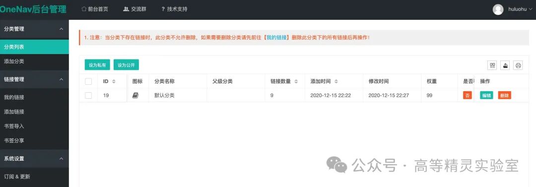 可以查看、修改、新建、删除分类,并支持将分类设置为私有或公开。