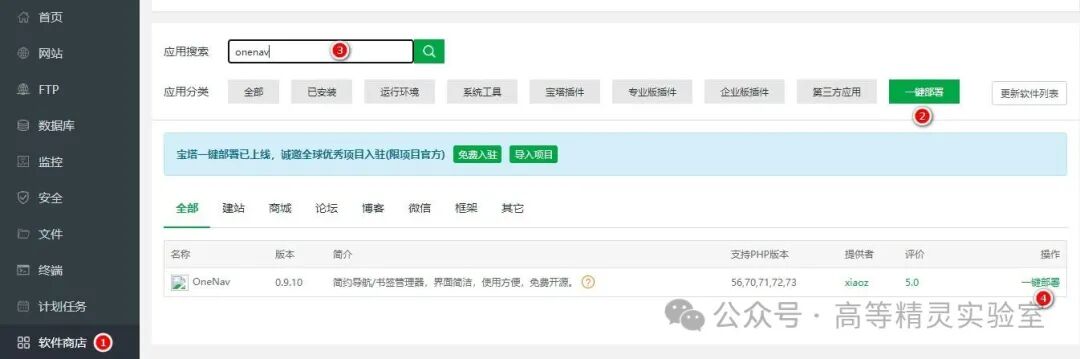 笔者虽没有使用宝塔,但使用宝塔的朋友却不少,在此就直接搬官方的文档了。OneNav已上架宝塔商店,通过宝塔后台 -> 软件商店 -> 一键部署 -> 搜索onenav,并点击一键部署。(上架宝塔需要人工审核,可能导致宝塔一键部署不是最新版本)。
