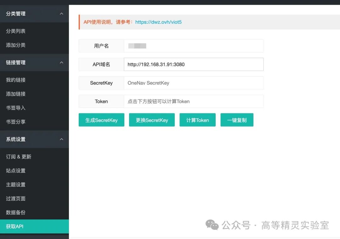 在OneNav后台->系统设置->获取API种生成一个Token: