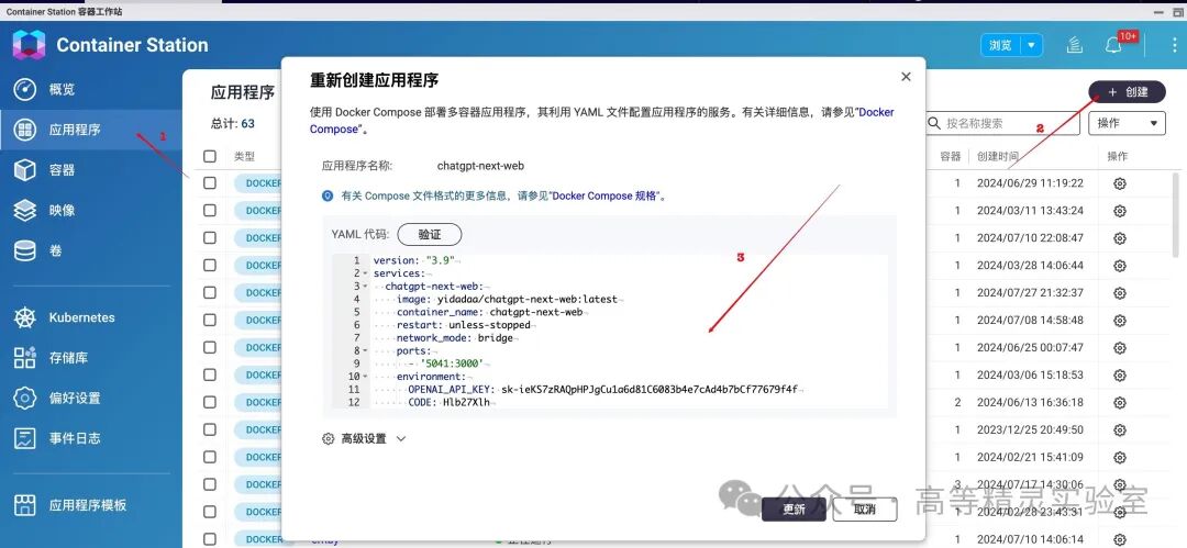如果你使用群晖或威联通,可以使用内置的Docker套件直接部署,方法也很简单,将1️⃣中的内容复制下来,然后打开套件,新建应用程序,将复制的内容粘贴进去,启动即可。
