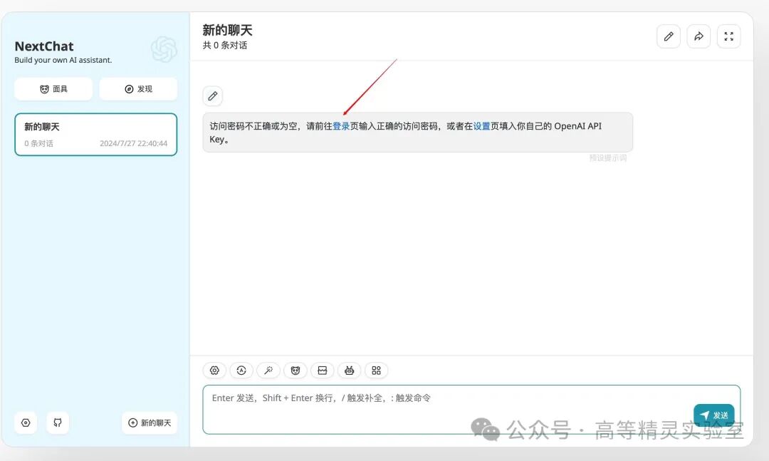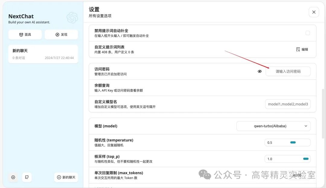 2️⃣ 如果你是安装上文中部署的Web版,则需要设置下你的登录密码,可以在设置界面设置,也可以在聊天界面设置。