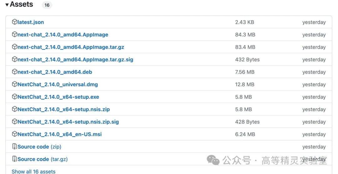 最后,如果你需要按照桌面版,可以在笔者公众号私信【NextChat】即可快速获取下载链接,打开链接后根据自己的平台下载即可,目前最新版本为v2.14.0。