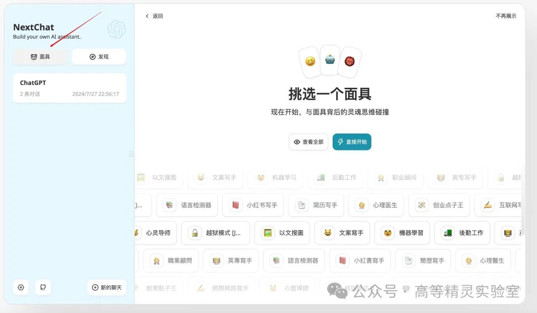 这个词大家可能不大理解是啥,其实就是提示词,系统预设了很多不同类型的面具,比如小红书写手、简历写手等等,点开面具界面就能看到。