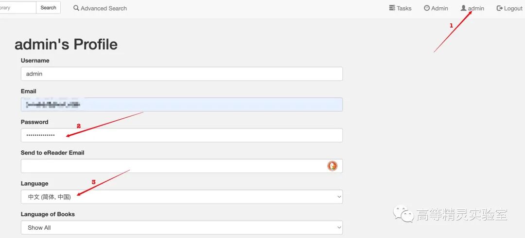 完成数据库设置完,其他功能就正常了。此时,请务必修改默认账户的密码,并可以将语言改为中文。记得要拉到页面最下面点击Save哦。