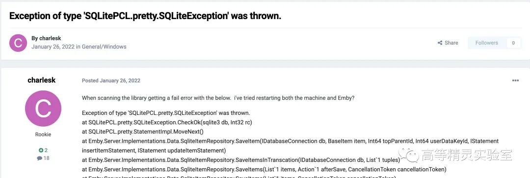 这位网友Happy2Play回复说:请上传一下embyserver.log日志以确定错误信息。于是提问的网友charlesk就老老实实上传了。此时笔者已经隐约感觉自己的Emby可能要出大事了。