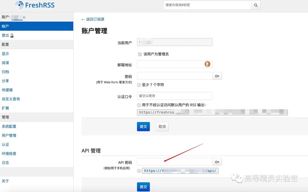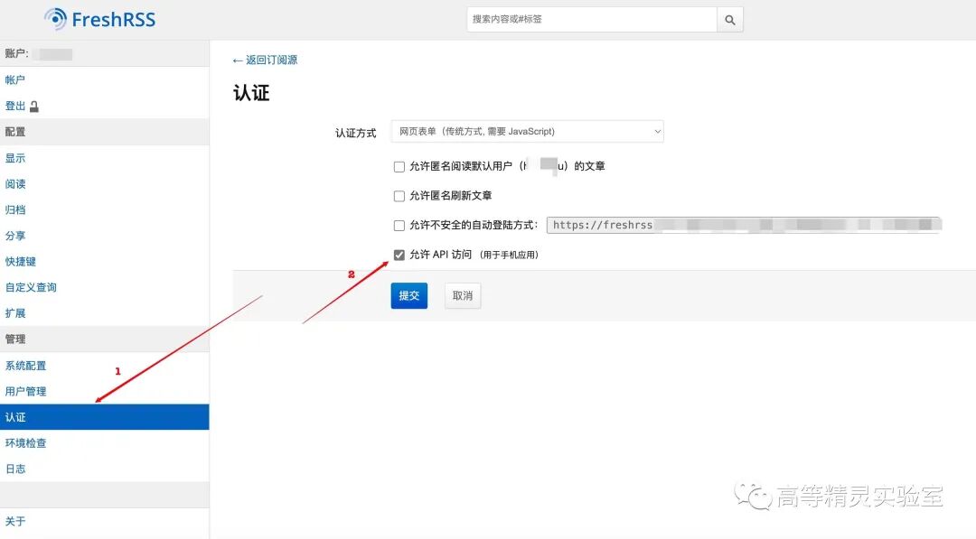 接下来,为了可以从移动端或桌面端客户端访问FreshRSS,需要开启 API 访问功能。从设置中,点击认证菜单,在右侧勾选允许API访问(用于手机应用),然后提交。