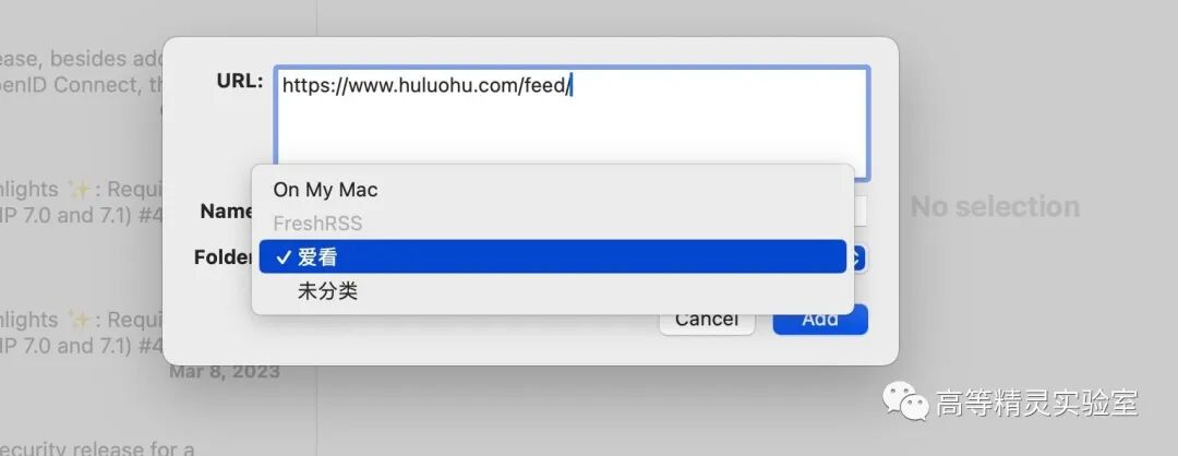 例如,笔者订阅自己的网站,则填写如下,最后点击Add即可完成 RSS 订阅添加。