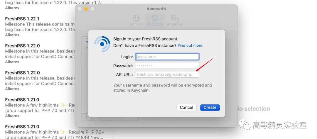 在弹出的面板中填写你的FreshRSS的API地址、账号和 API 密码(注意是API密码,不是登录密码)。其中 API 地址的格式为:ip:端口/api/greader.php。