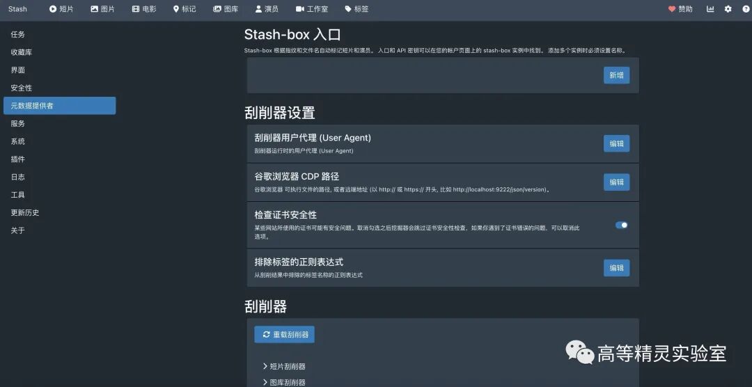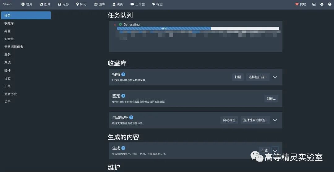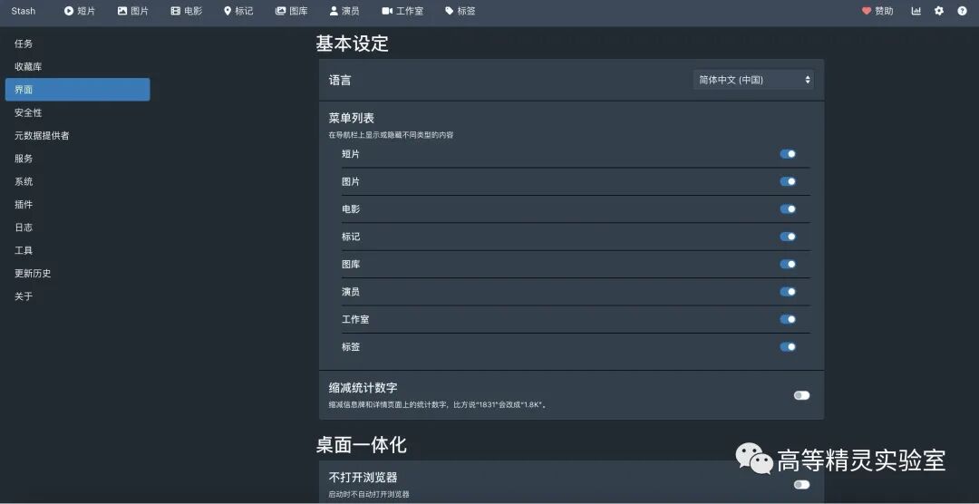 进入主界面太辣眼了,笔者就不放出来了哈。在界面顶部分别排列了短片、图片、电影、标记、图库、演员、工作室和标签这些分类,这些懂得都懂,就不细说了。直接点击右上角的⚙️图标,进入设置界面,可以对任务、收藏库、界面、安全性、元数据、服务、系统、插件等等方面进行各种高级设置。