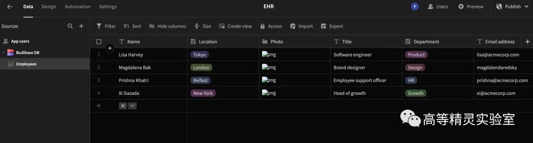 Budibase支持多种数据源,包括MongoDB、CouchDB、PostgreSQL、MySQL、Airtable、S3、DynamoDB以及REST API。这意味着你不再受限于单一的数据来源,可以灵活地根据业务需求选择合适的数据源。