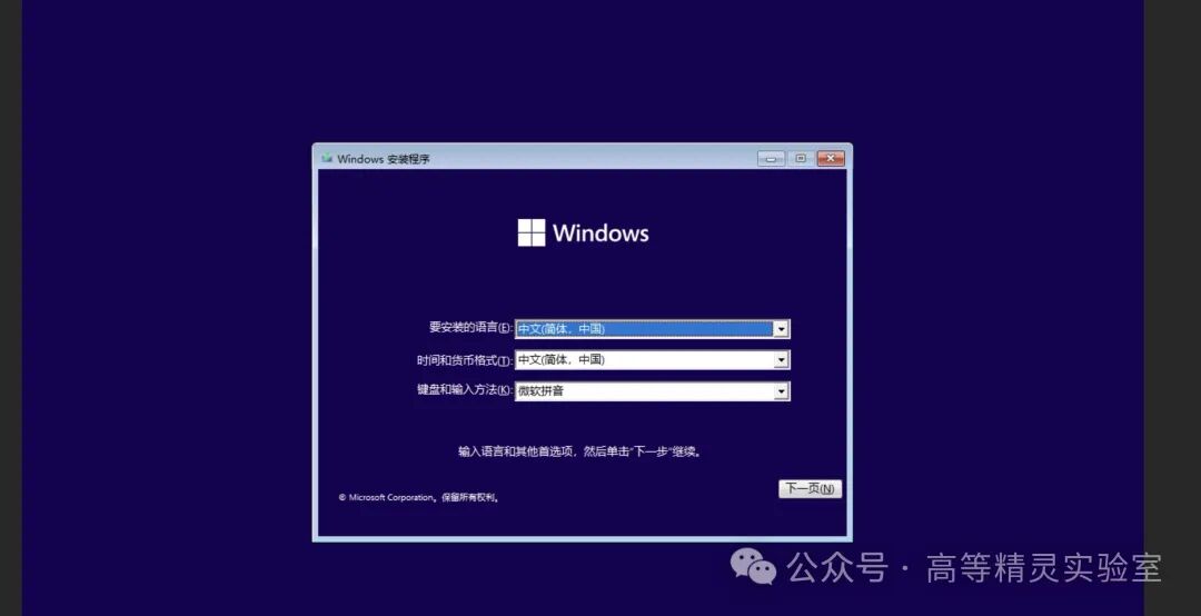 出现这个界面就可以正式开始了!选择完语言、时间和货币格式、输入法,然后点下一页。