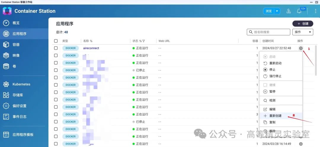 等到镜像更新完成后,回到应用程序中,找到你需要更新的应用,同样点击右边的小齿轮,在弹出的菜单中点击重新创建,就会自动重新创建应用中包含的Docker容器了(就是更新的意思)。