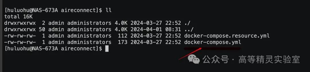 进入到aireconnect文件夹后,我们使用ll命令可以看到里面保存好的docker-compose.yml文件。