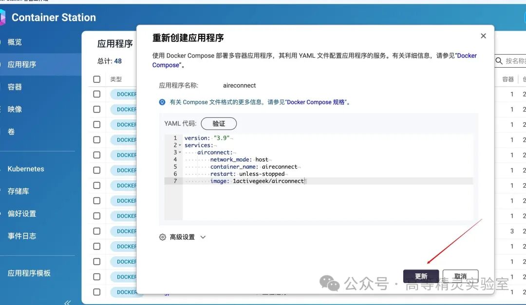 # 1、切换到应用文件夹下,将`应用的名字`改成你自己的cd /share/Container/container-station-data/application/应用的名字# 2、更新镜像docker compose pull# 3、重建容器docker compose up -d