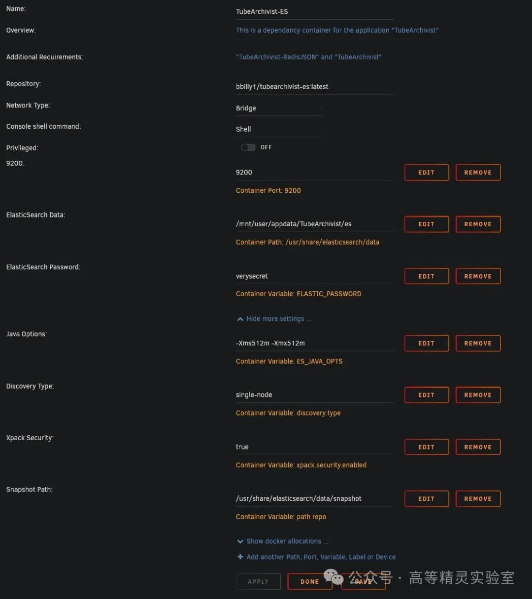 version: '3.9'services: tubearchivist: container_name: tubearchivist restart: unless-stopped image: bbilly1/tubearchivist ports: - 8000:8000 volumes: - ./media:/youtube - ./cache:/cache environment: - ES_URL=http://archivist-es:9200 # ES的地址和端口 - REDIS_HOST=archivist-redis # Redis - HOST_UID=1000 - HOST_GID=1000 - TA_HOST=tubearchivist.local # host名称或域名地址 - TA_USERNAME=tubearchivist # 设置tubearchivist的管理员账号 - TA_PASSWORD=verysecret # 设置tubearchivist的管理员密码 - ELASTIC_PASSWORD=verysecret # ES的密码 - TZ=Asia/Shanghai # 时区 healthcheck: test: ["CMD", "curl", "-f", "http://localhost:8000/health"] interval: 2m timeout: 10s retries: 3 start_period: 30s depends_on: - archivist-es - archivist-redis archivist-redis: image: redis/redis-stack-server container_name: archivist-redis restart: unless-stopped expose: - "6379" volumes: - ./redis:/data depends_on: - archivist-es archivist-es: image: bbilly1/tubearchivist-es container_name: archivist-es restart: unless-stopped environment: - "ELASTIC_PASSWORD=verysecret" # 设置ES的密码 - "ES_JAVA_OPTS=-Xms512m -Xmx512m" - "xpack.security.enabled=true" - "discovery.type=single-node" - "path.repo=/usr/share/elasticsearch/data/snapshot" ulimits: memlock: soft: -1 hard: -1 volumes: - ./es:/usr/share/elasticsearch/data expose: - "9200"