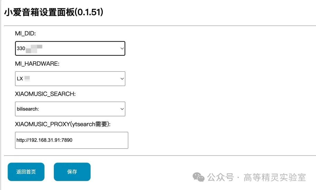 首先点击音量条右侧的齿轮⚙️按钮,进入设置界面,其中MI_DID、MI_HARDWARE、XIAOMUSIC_SEARCH三项直接从下拉列表中选择即可,XIAOMUSIC_PROXY设置成你自己的代理地址(非必需)。设置完成后点击保存,然后返回首页。