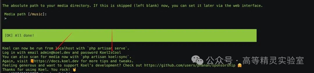 最后,会提醒设置音乐文件目录,保持不变,直接回车即可,然后就可以看到初始化是自动创建的默认管理员账户的用户名和密码了,记得复制下来。