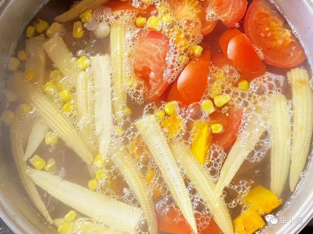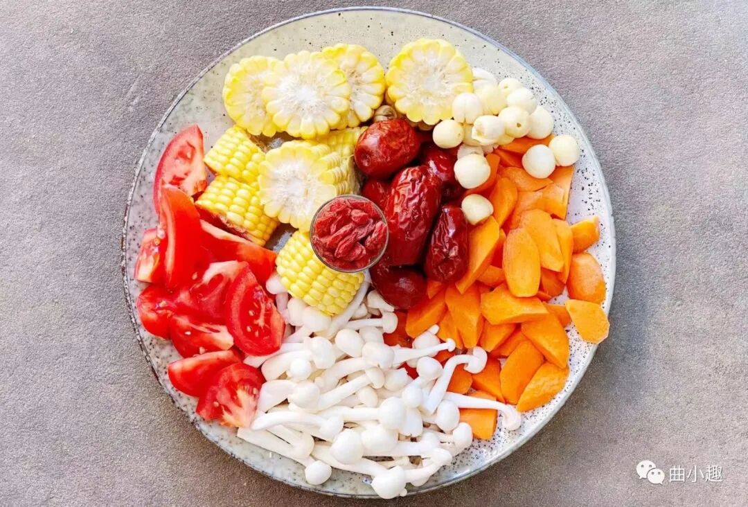 桃胶过夜浸泡,玉米笋对半切,南瓜、胡萝卜、番茄切块