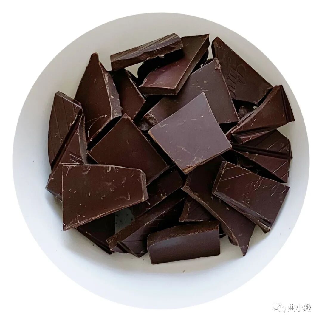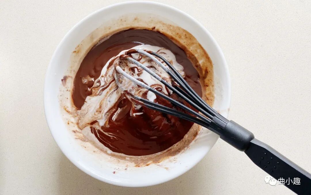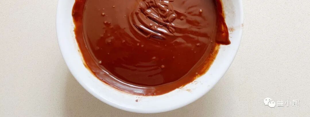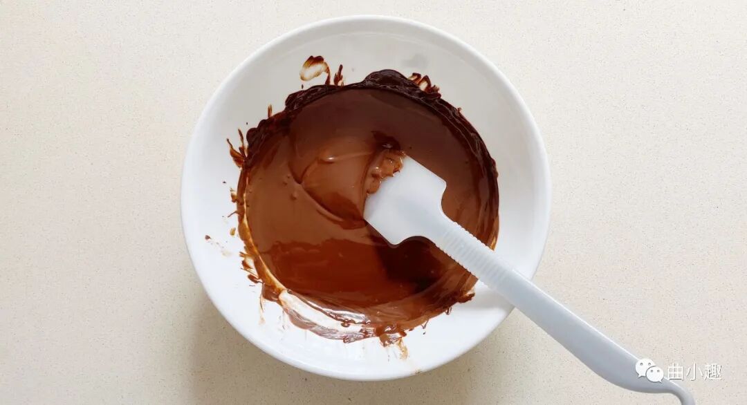 锅中加水烧热,隔水融化黑巧克力。同时用同样方法加热椰奶油。把奶油倒入融化的黑巧克力中,搅打成细腻的巧克力浓浆。