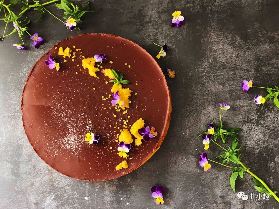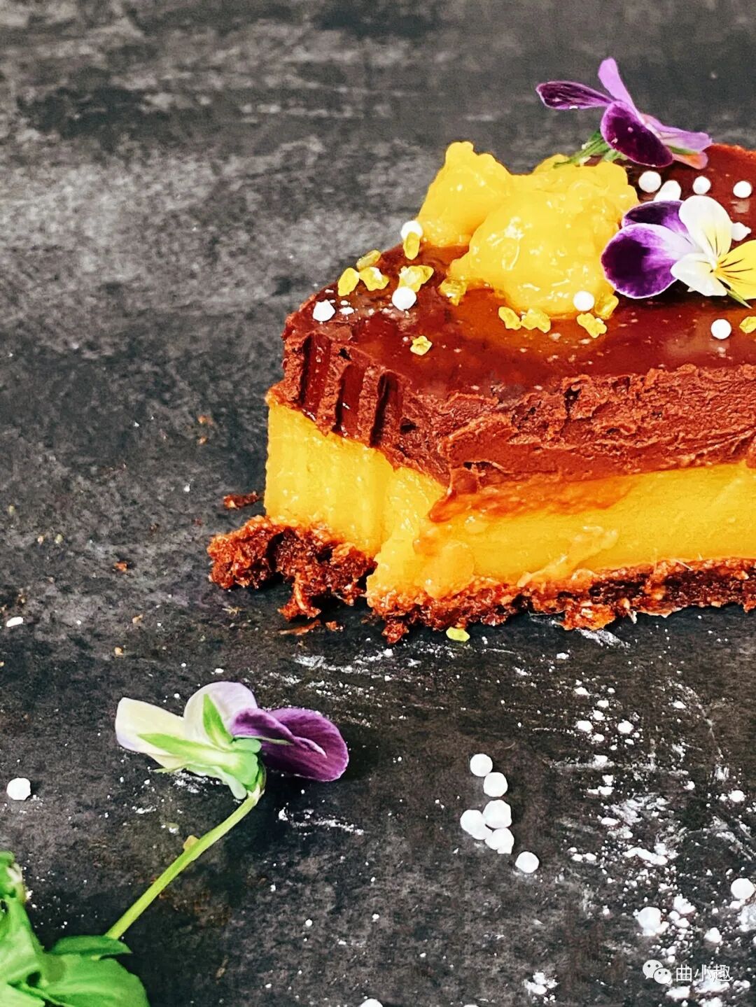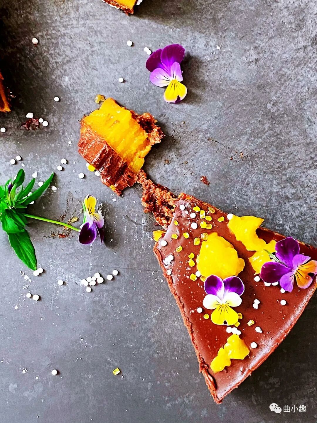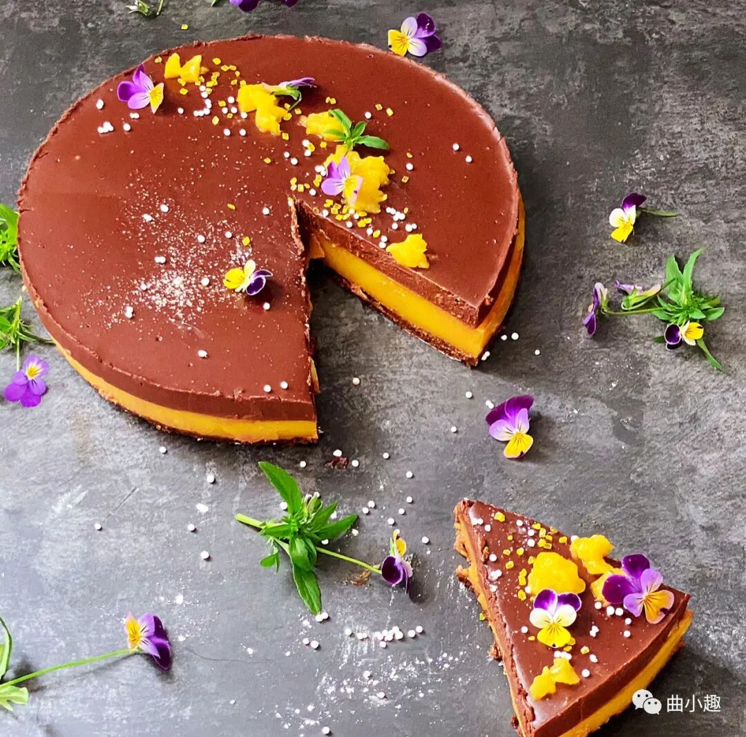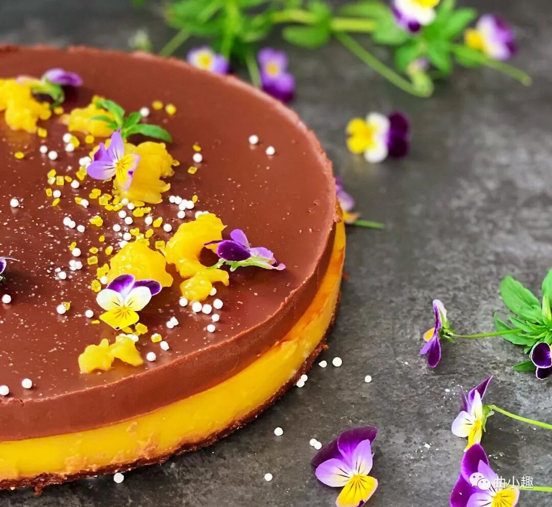 凝固后的蛋糕取出,表面撒上少许芒果泥,食用花、薄荷叶、糖豆等随意装饰。