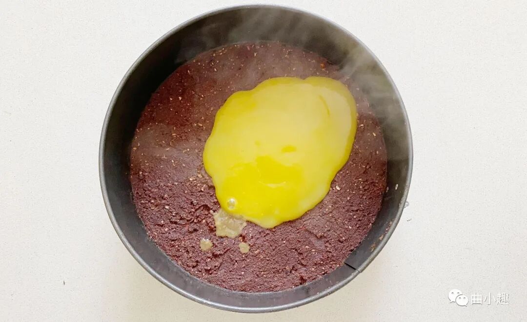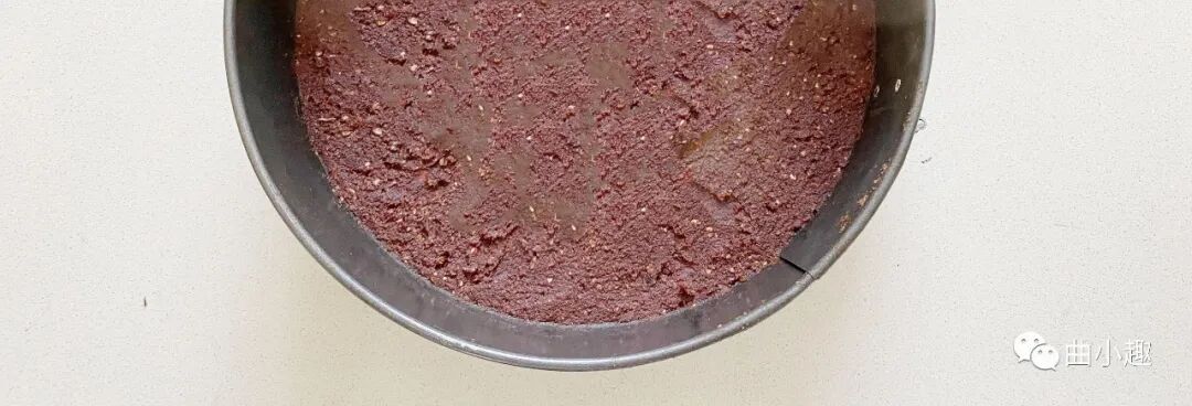 准备蛋糕托盘,手戴上厨用手套,把搅拌好的杏仁巧克力泥铺平。放入冰箱冷藏一小时左右。