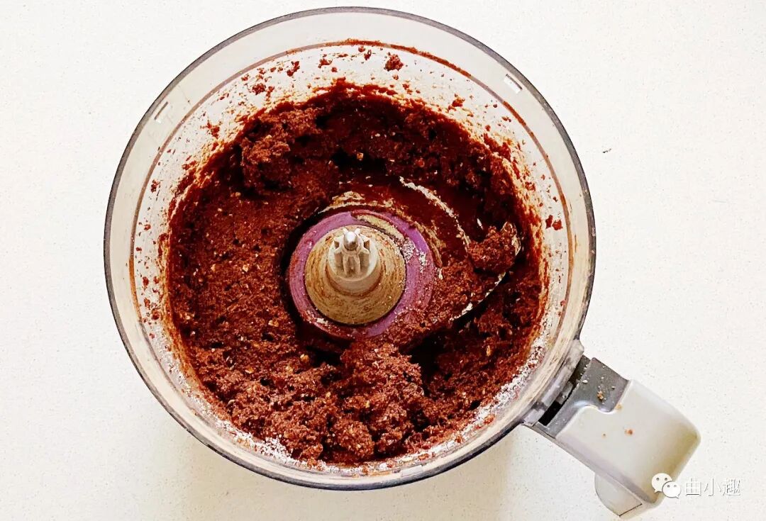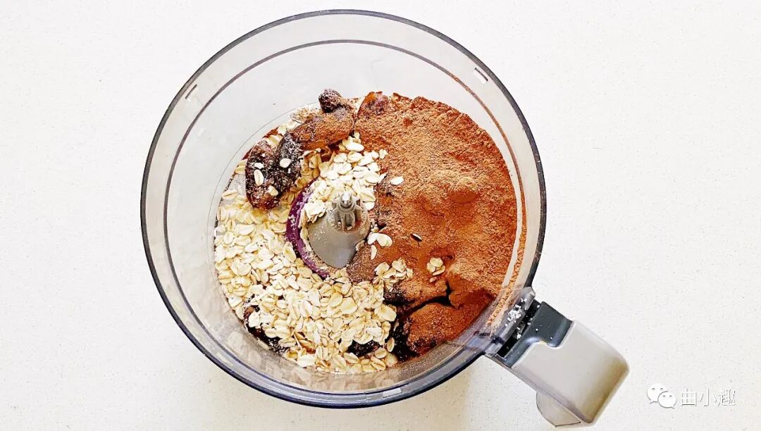 燕麦片放入料理机打碎,继续放入椰枣、杏仁粉、可可粉一起用料理机搅拌,适量加一点水,以免太干,不用搅拌太久,保留适量颗粒。