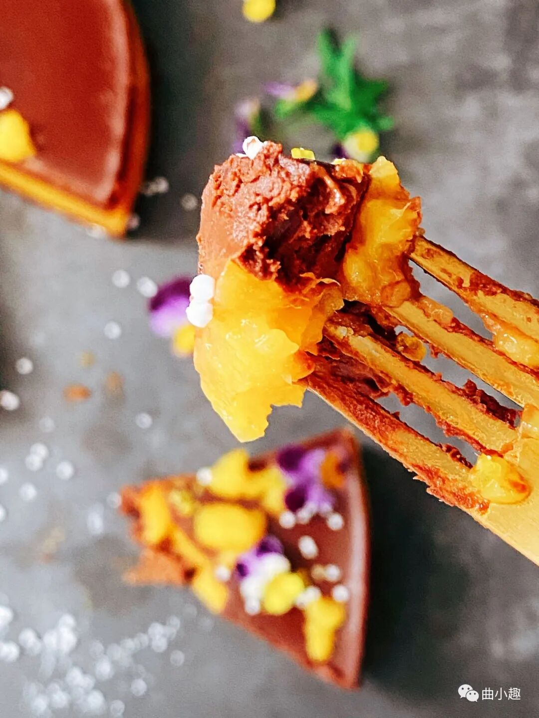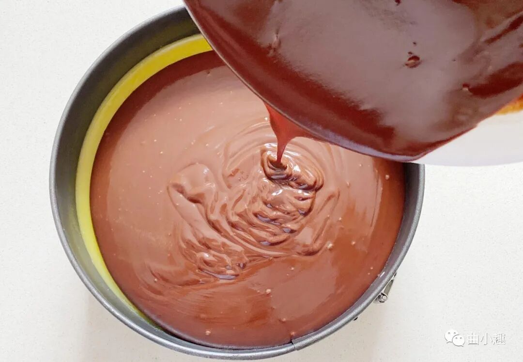 将巧克力浓浆倒入已经凝固的芒果层上。轻轻震动托盘,使巧克力浆更平整。放入冰箱冷藏两小时,也可冷冻半小时以加快凝固。