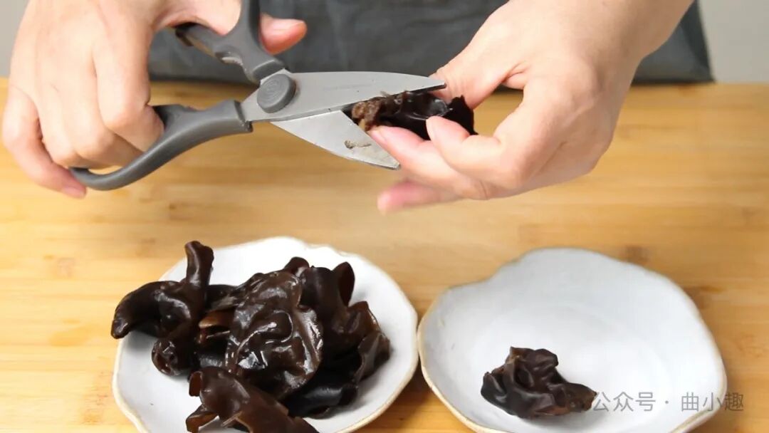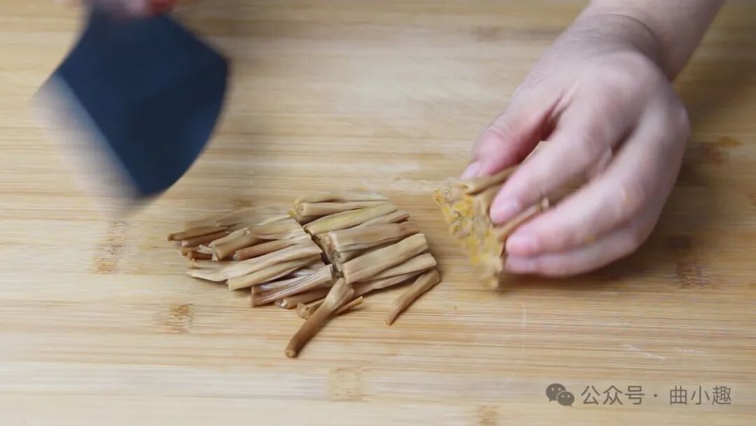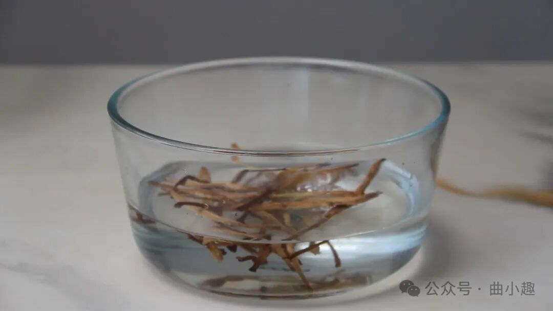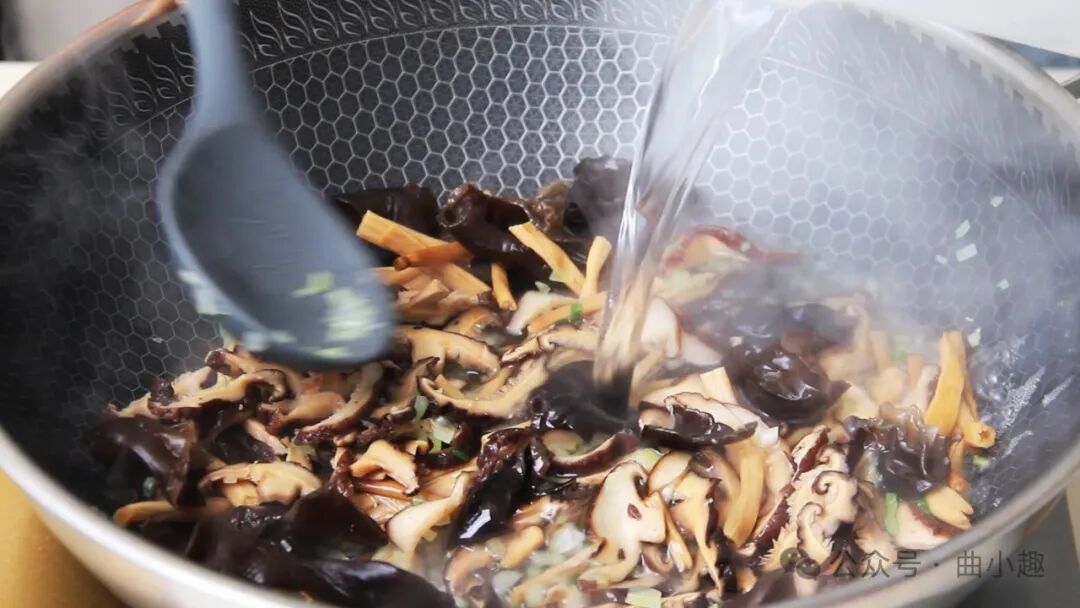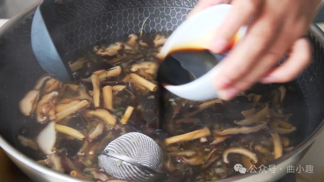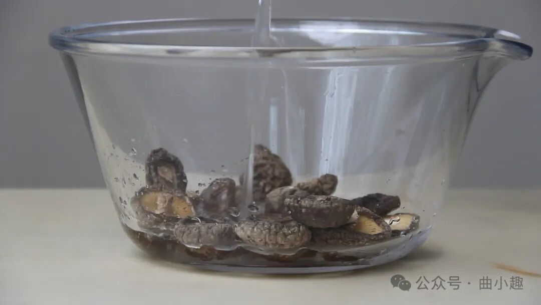 香菇洗净,提前泡发,香菇水留着备用;木耳、黄花菜泡发|Clean shiitake mushrooms, soak them in advance, and reserve the soaking water; soak black fungus and daylily.