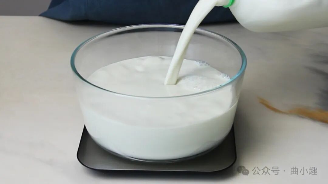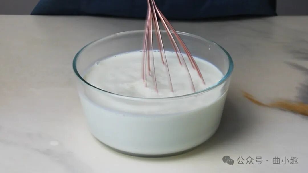取一个大碗,放入3克(3/4茶匙)葡萄糖酸内脂,倒入豆浆,用搅拌器搅拌均匀,不需要撇去浮沫|Take a large bowl, add 3g of gluconolactone, pour in soy milk, and mix evenly without skimming the foam.