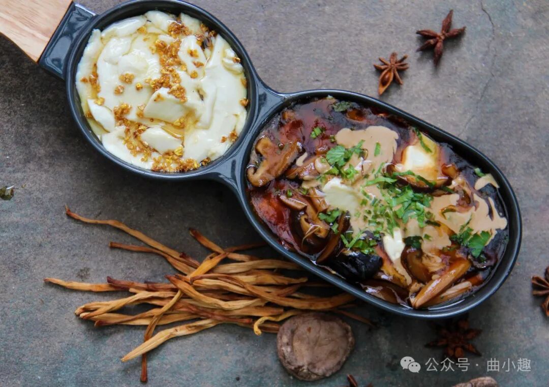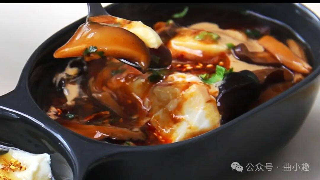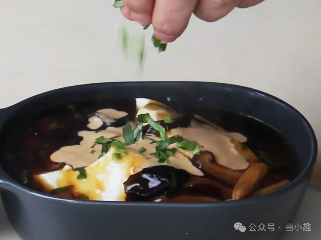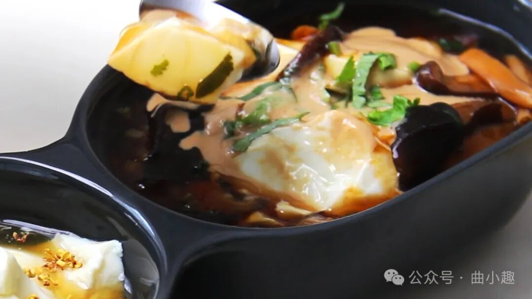 把凝固好的豆腐脑盛入碗中,舀几勺卤汁,浇上一勺麻酱,撒点香菜,还可以按照自己喜好,滴几滴香油或者辣椒油|Spoon the set tofu pudding into a bowl, add a few spoons of the savory sauce, top with a spoon of sesame sauce, sprinkle with cilantro, and add a few drops of sesame oil or chili oil if desired.
