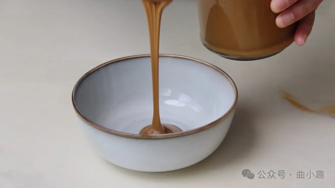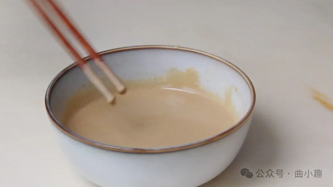 等待期间,调麻酱汁:取3勺麻酱,取锅中煮开的汤汁,边搅拌边加汤汁,顺着一个方向搅,搅成糊状,中间可适量添加盐|Prepare sesame sauce: Take 3 spoons of sesame paste, add boiling soup from the pot while stirring in one direction until smooth. Add salt as needed