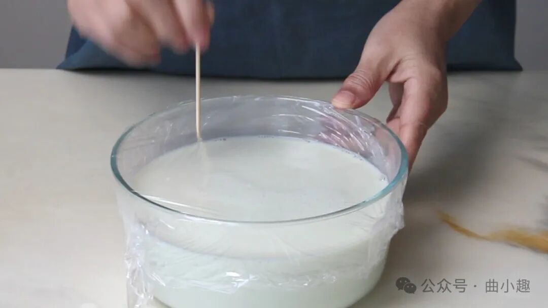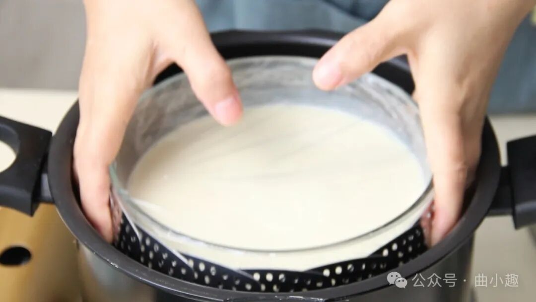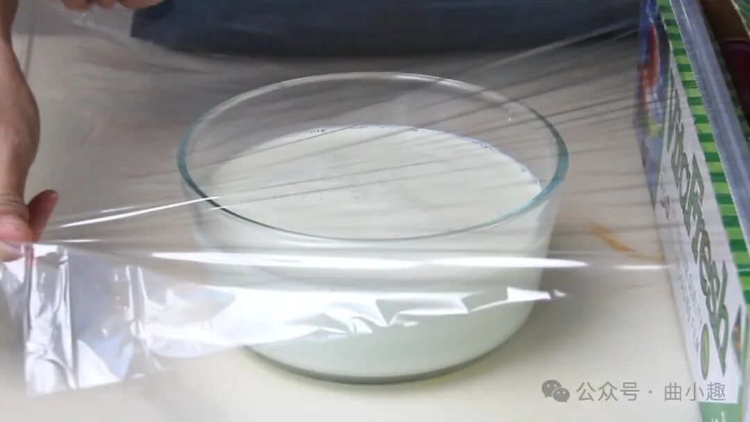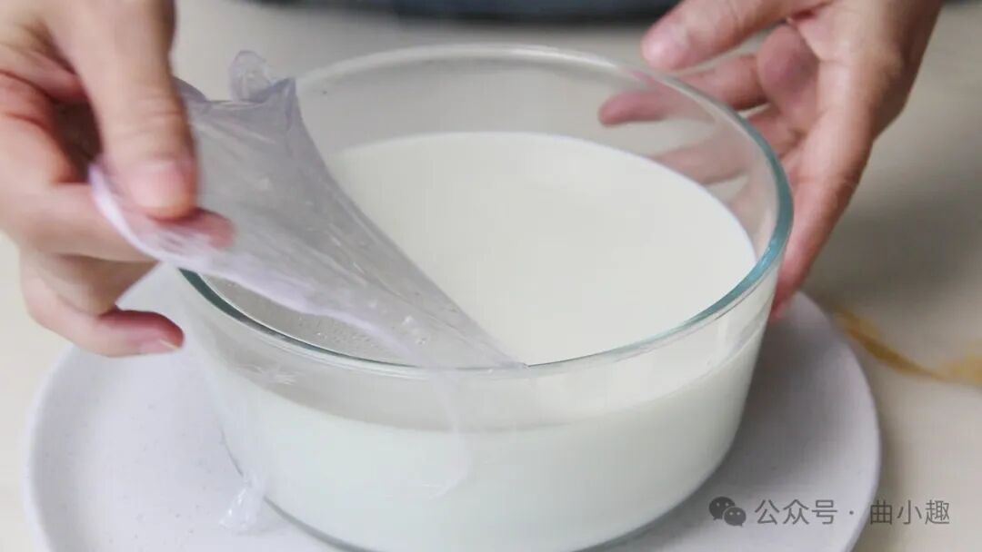 关火后,取出。打开保鲜膜,白玉般细滑的豆腐脑就在眼前|Remove the plastic wrap, and the tofu pudding is ready