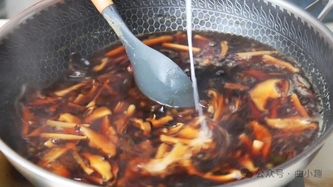 把淀粉和水按1:1调成水淀粉,倒入锅中,一边倒一边搅,达到自己喜欢的浓度即可,不用全倒入,关火|Mix starch and water in a 1:1 ratio to make a slurry, add to the pot while stirring to the desired consistency. Turn off the heat