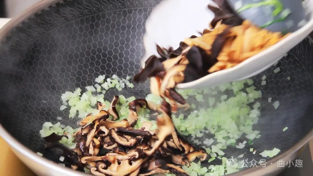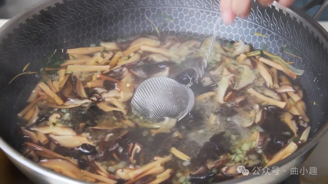 热锅不加油,放入芹菜末稍微翻炒,加入香菇、木耳、黄花菜,倒入水加香菇水共1000毫升,调味盒放入锅中煮开|Heat a dry pan, add celery, and stir-fry briefly. Add shiitake mushrooms, black fungus, and daylily, then add water and reserved mushroom soaking water to make 1500ml. Add the seasoning bag to the pot. Bring to a boil