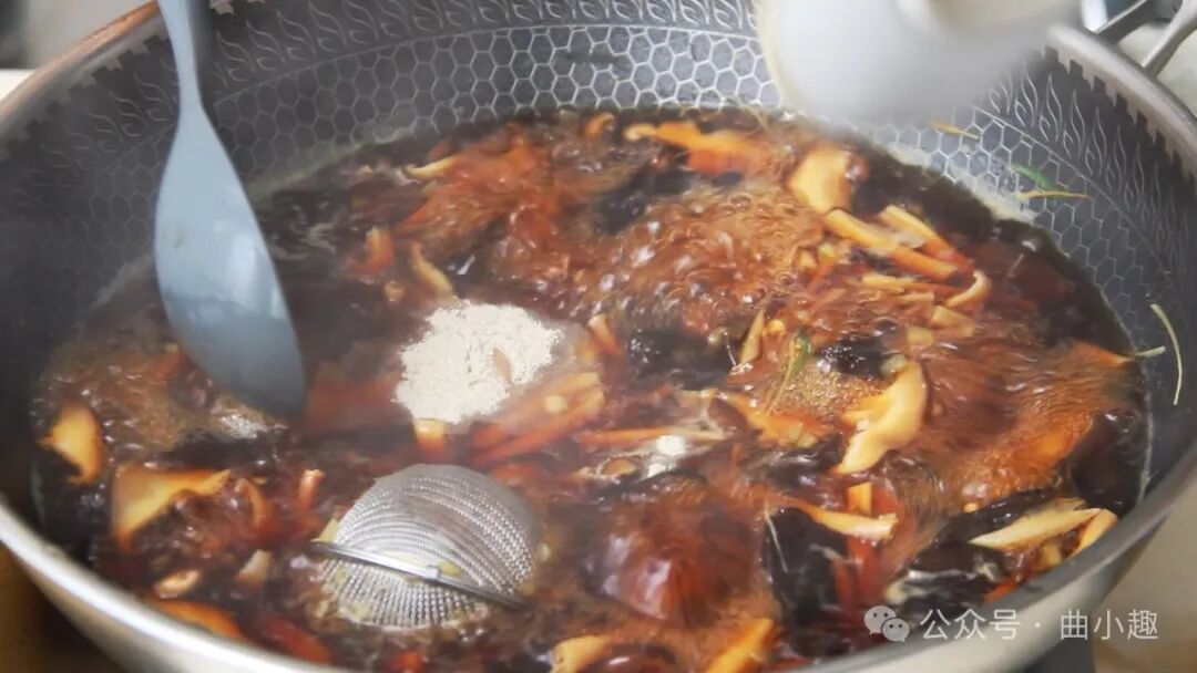 锅开后加生抽、老抽、白胡椒、香菇粉,再根据咸度添加适量的盐,煮2-3分钟后,捞出调味盒 | After boiling, add light soy sauce, dark soy sauce, white pepper, and mushroom powder. Adjust salt to taste and cook for 2-3 minutes,take out the seasoning bag