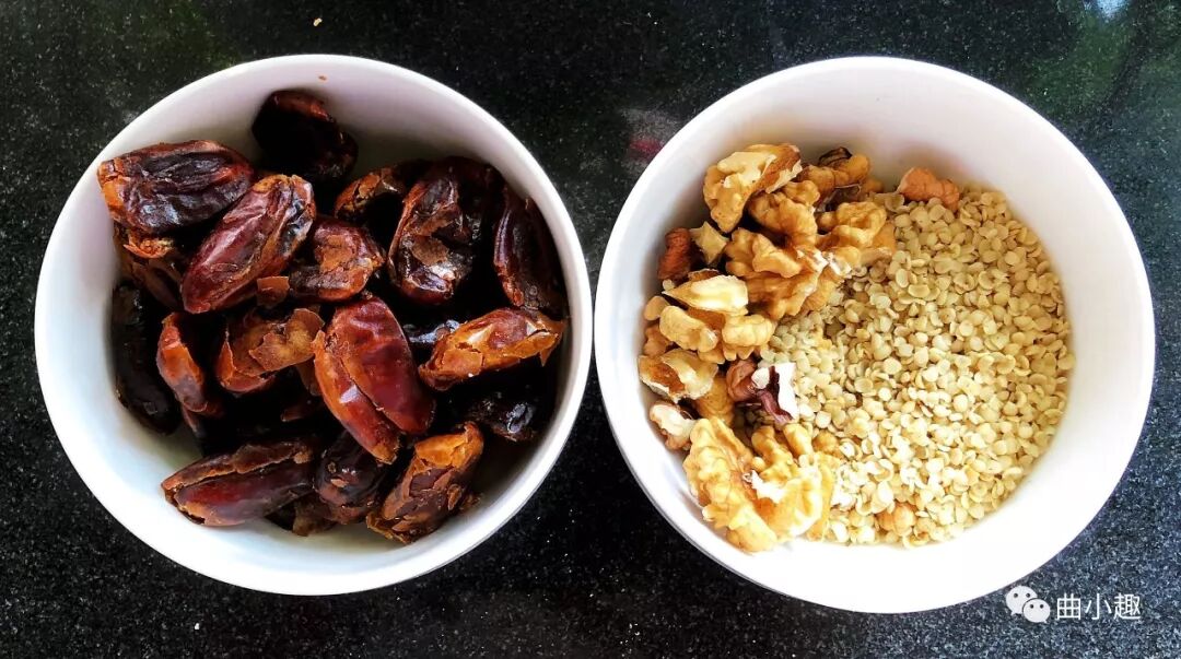 准备馅料食材:核桃50克、火麻仁50克、椰枣100克