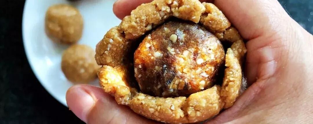 2,把饼皮压扁,包入馅料,封口、搓圆。