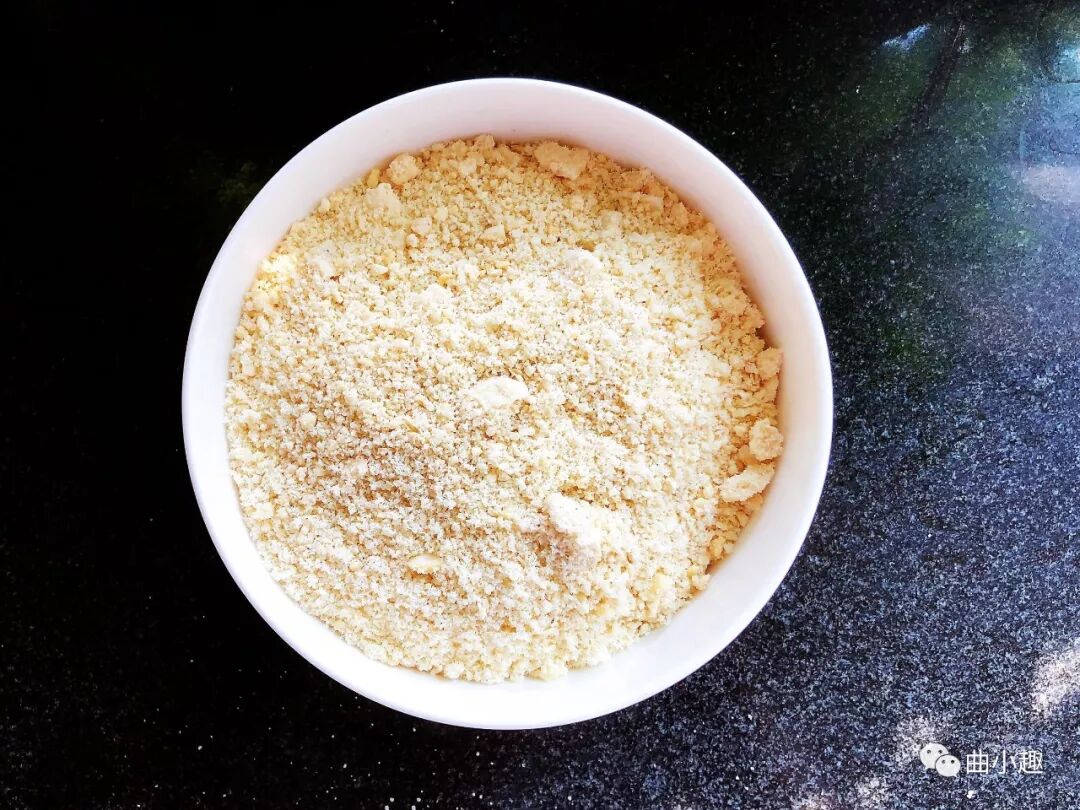 3,糯米粉分两半,一半蒸熟或炒熟成熟糯米粉,另一半加水蒸20分钟成半透明糯米泥(水与糯米粉1:1和成面团,然后摊平在盘子上蒸熟)。