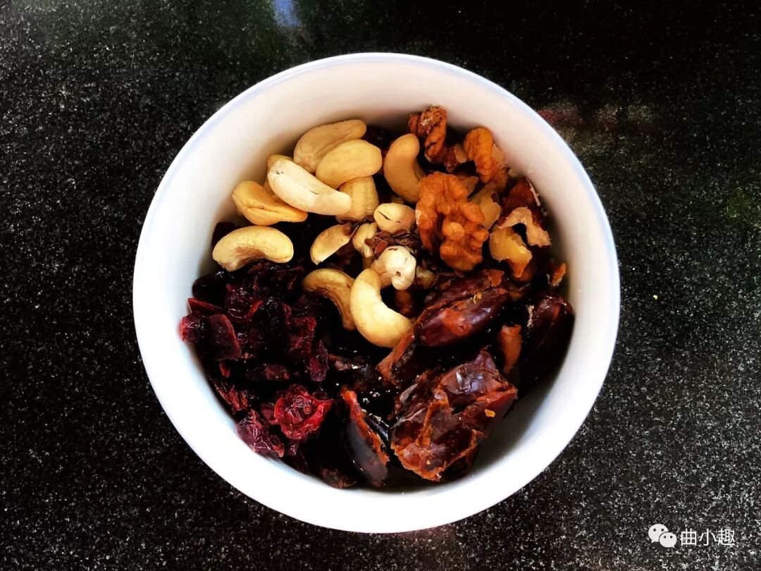 准备馅料食材:核桃50克、腰果50克、去核椰枣30克、亚麻籽30克、蔓越莓40克