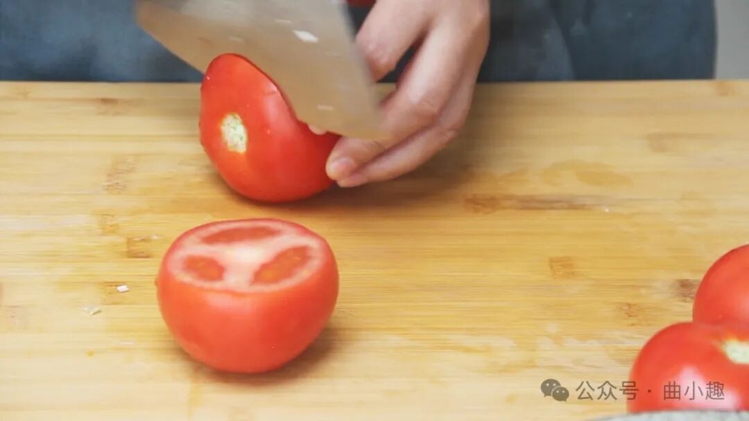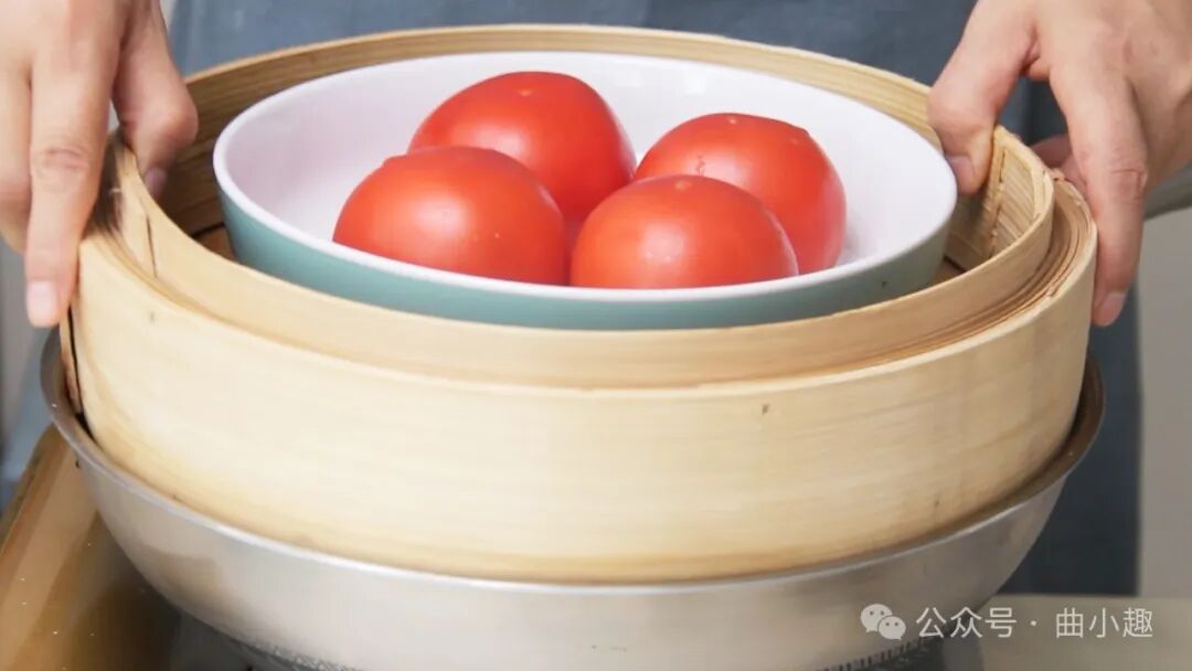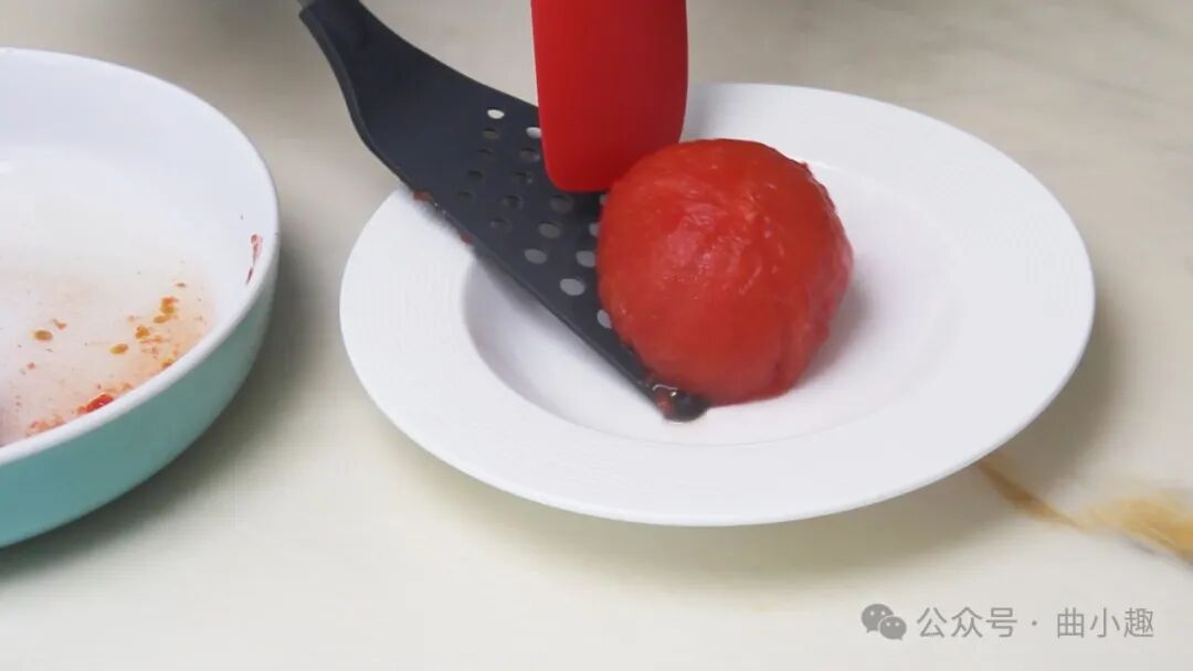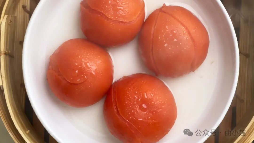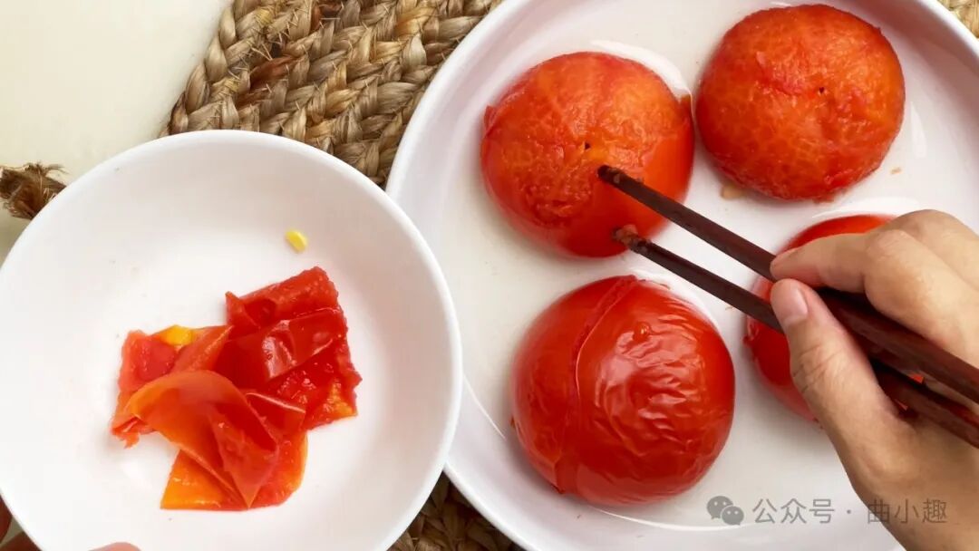 关火,此时番茄皮应该已经裂开,小心地剥掉番茄皮|Turn off the heat. By now, the tomato skins should have cracked open. Gently peel off the tomato skins