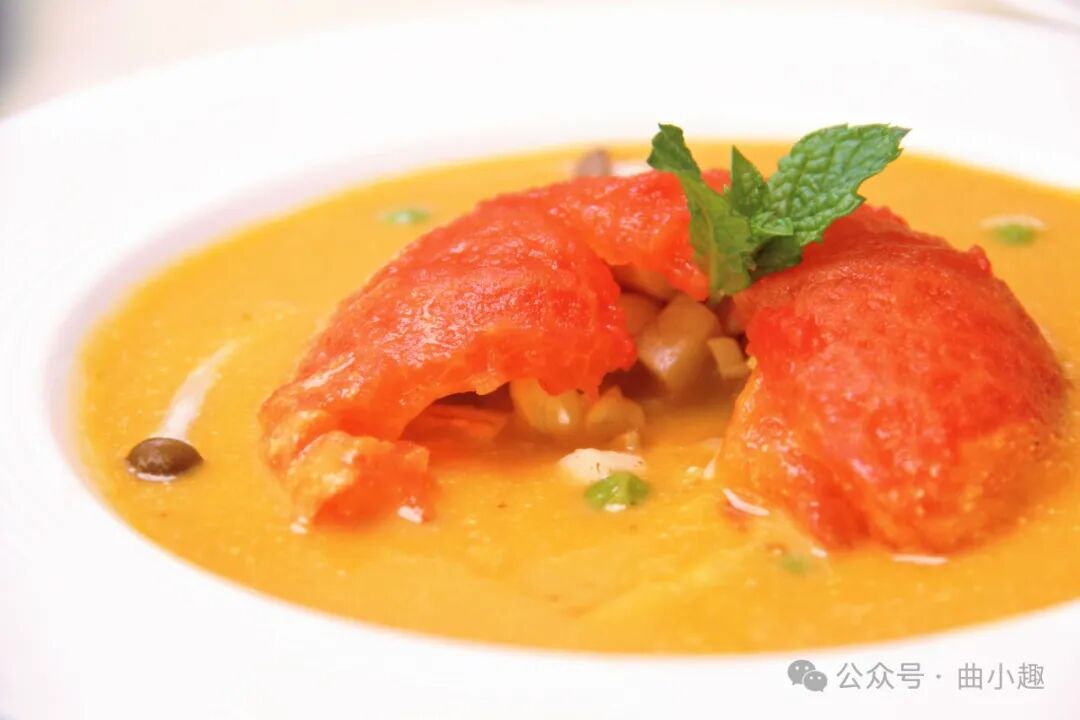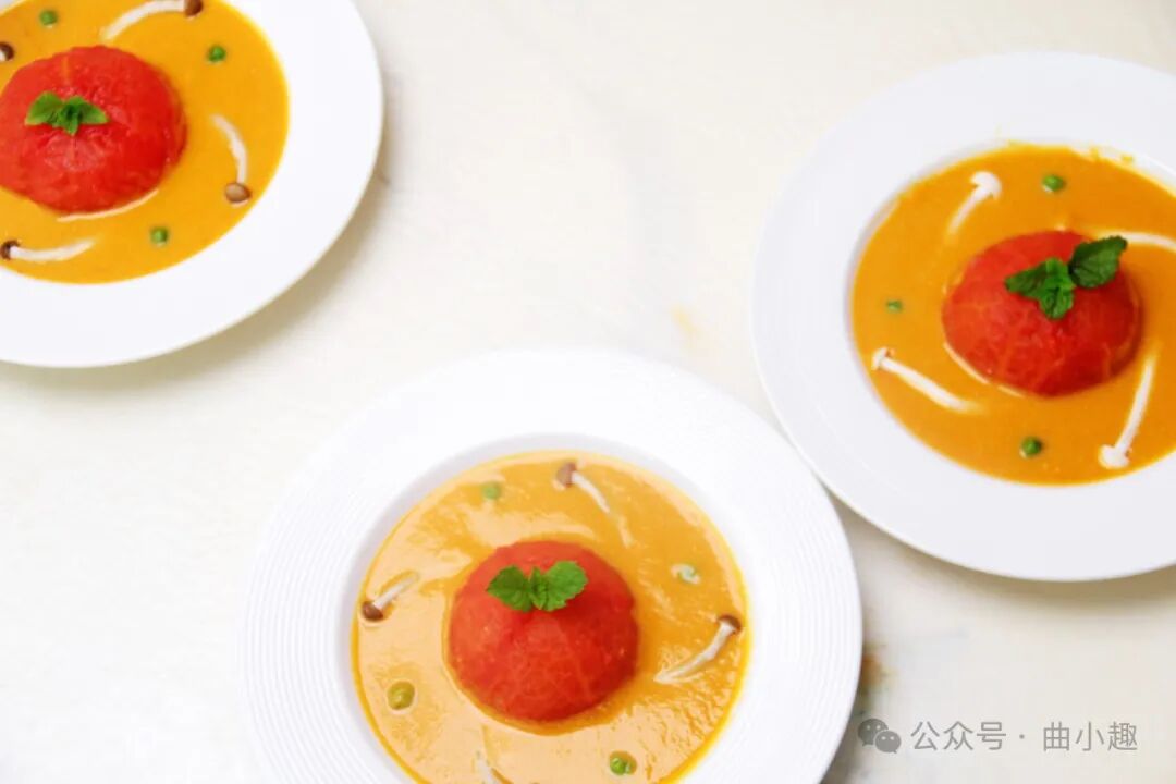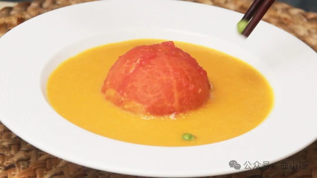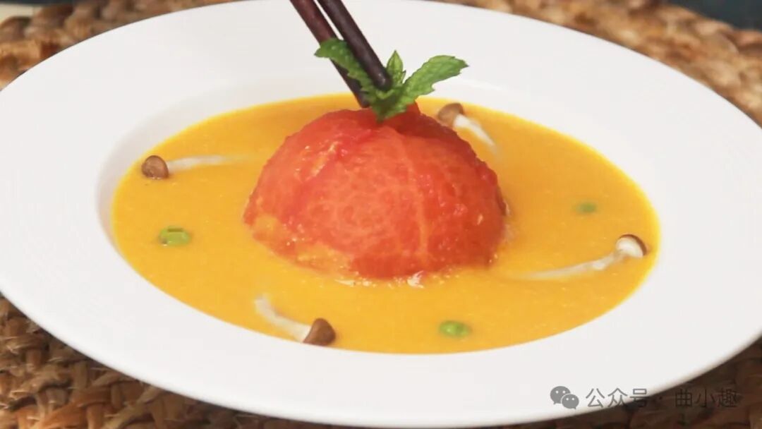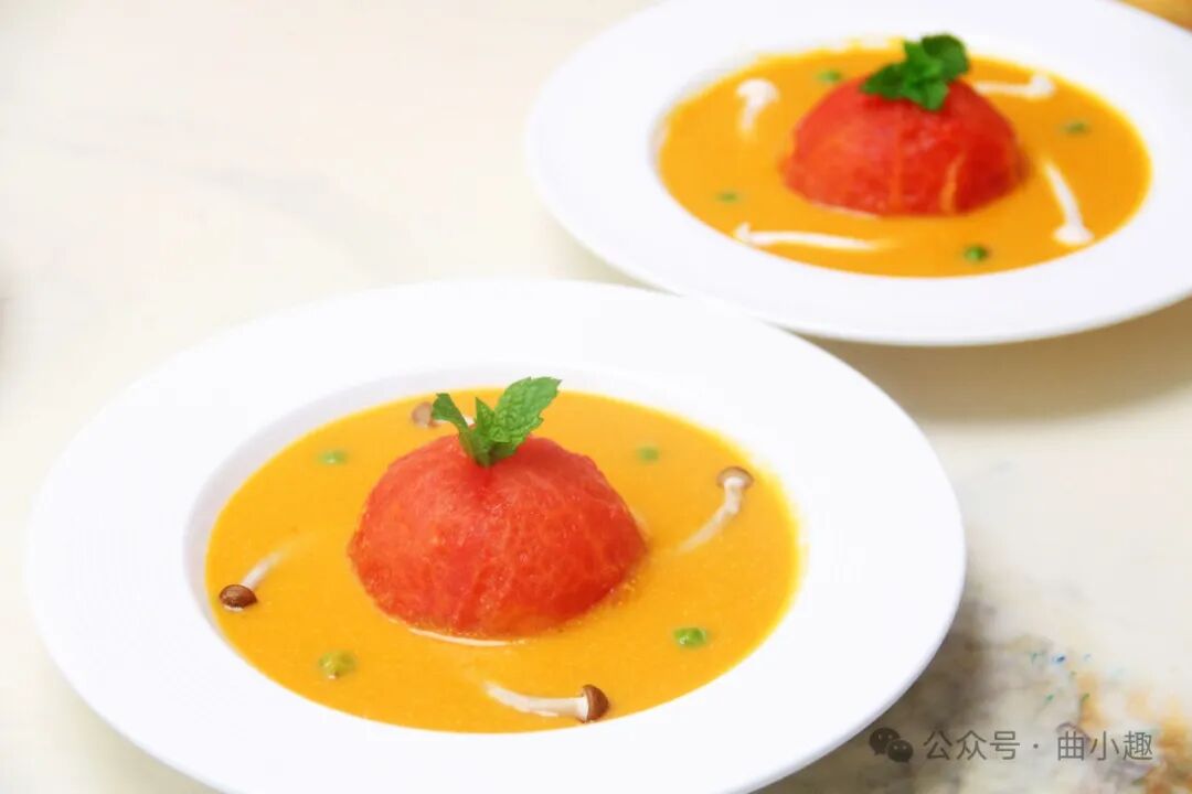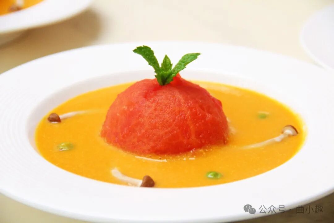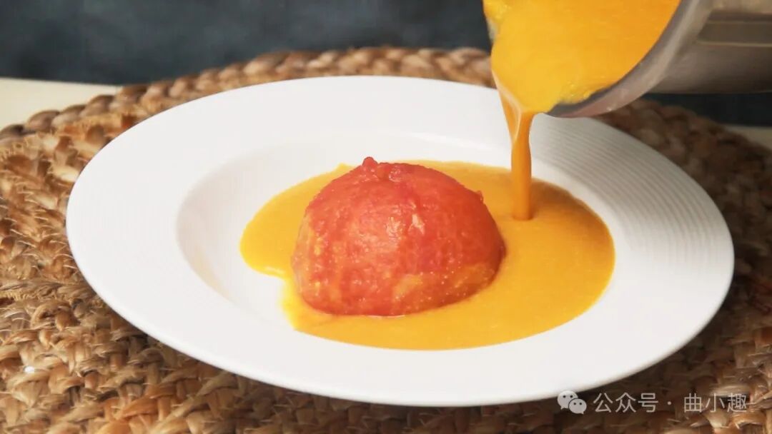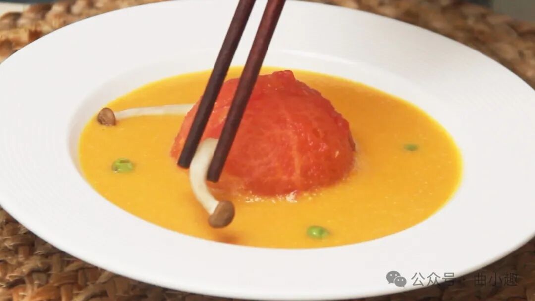 将金色汤汁倒入装有番茄的盘子中,上面点缀焯熟的豌豆、小蘑菇,可以根据个人喜好加上薄荷叶|Pour the golden soup into the plate with tomatoes, garnish with blanched green peas, button mushrooms, and optionally mint leaves on top