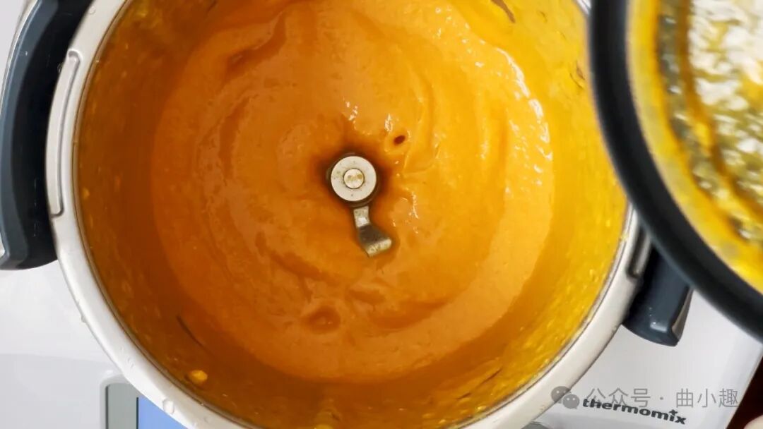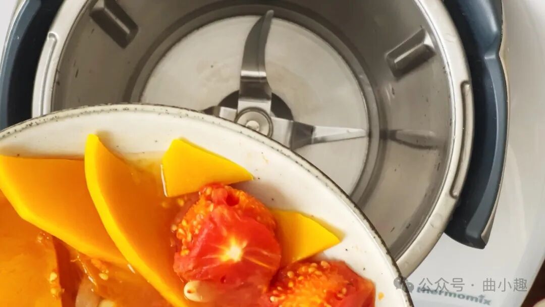将蒸好的南瓜、腰果、番茄瓤、番茄蒂和皮放入破壁机,加入2汤匙枫糖浆,搅拌成顺滑的南瓜番茄汤|Place the pumpkin, cashews, tomato flesh, stems, and skins into a blender, add 2 tablespoons of date syrup or maple syrup, blend into a smooth pumpkin tomato soup.