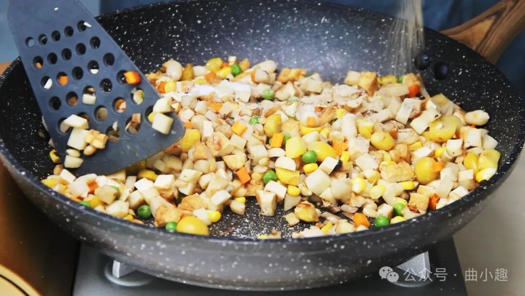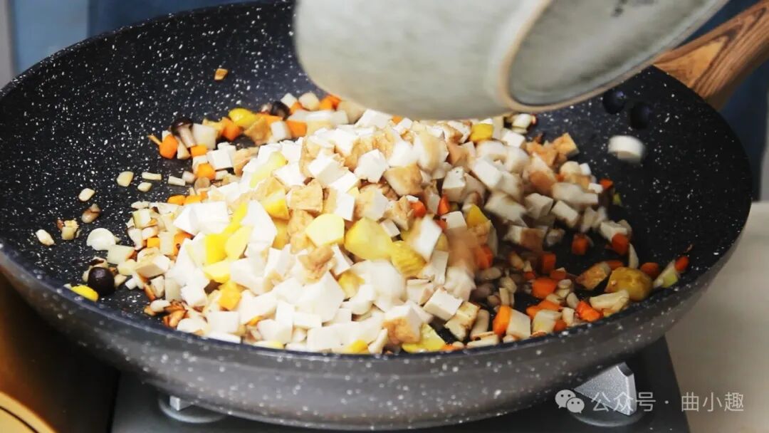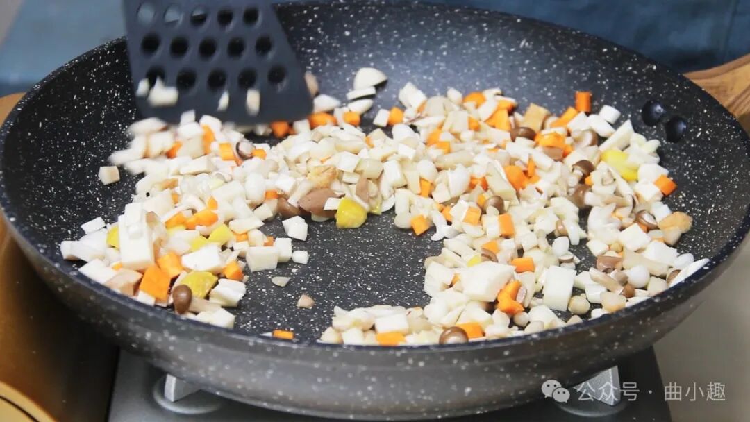锅中无油或少油,加蘑菇丁翻炒至焦黄,然后加入芋头、山药、胡萝卜和白果,继续翻炒出香|Heat a little oil in a pan, add diced mushrooms first, stir-fry until fragrant, then add taro, Chinese yam, carrots, and gingko nuts, continue stir-frying until fragrant