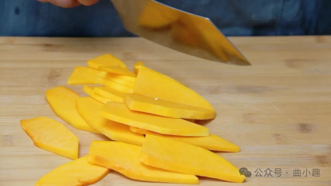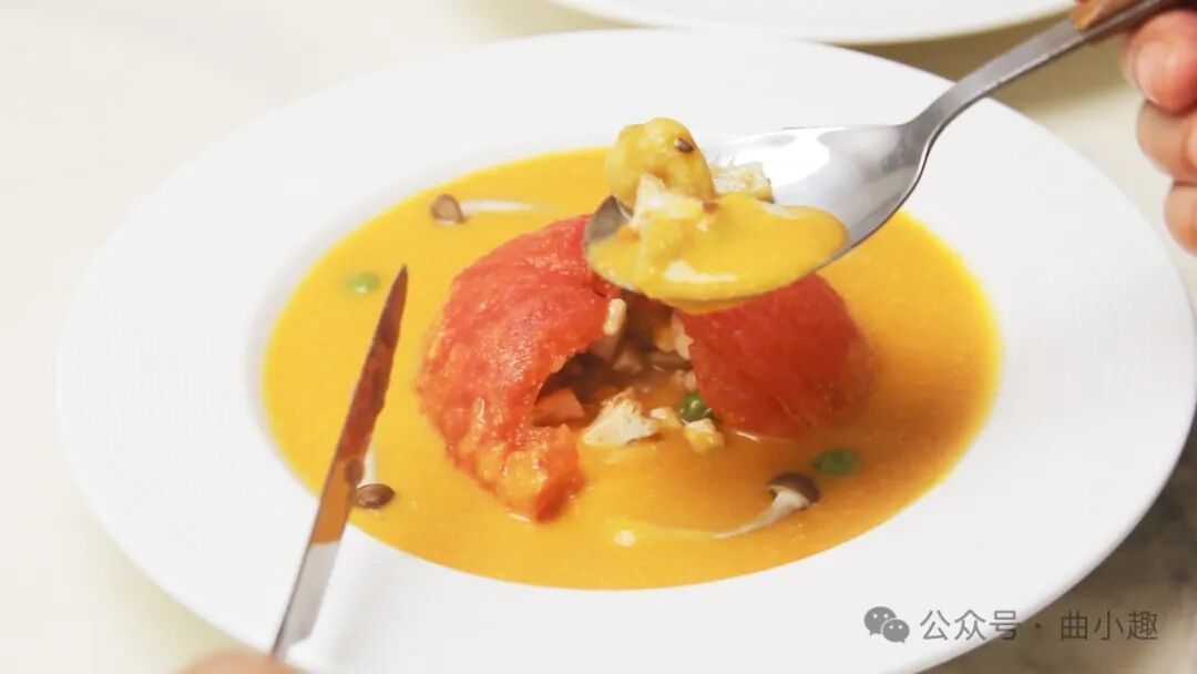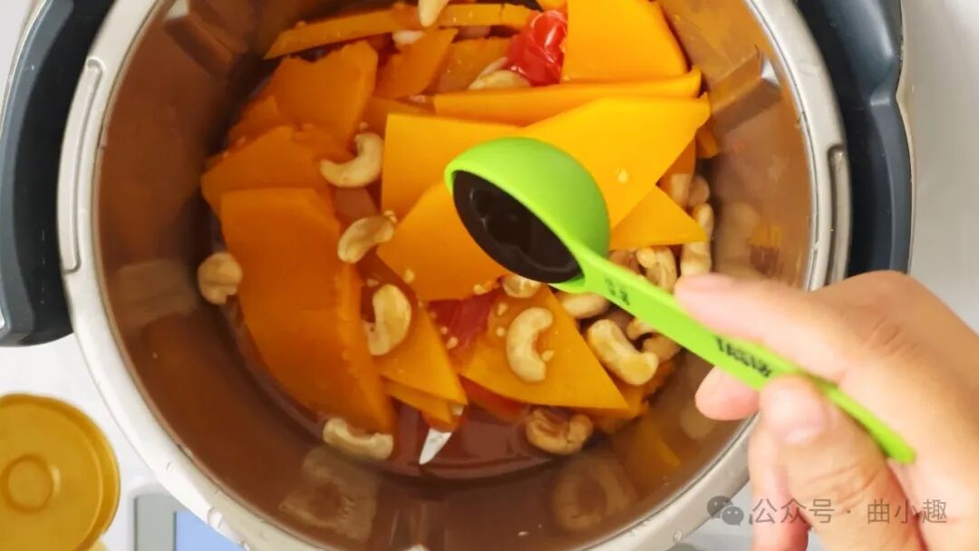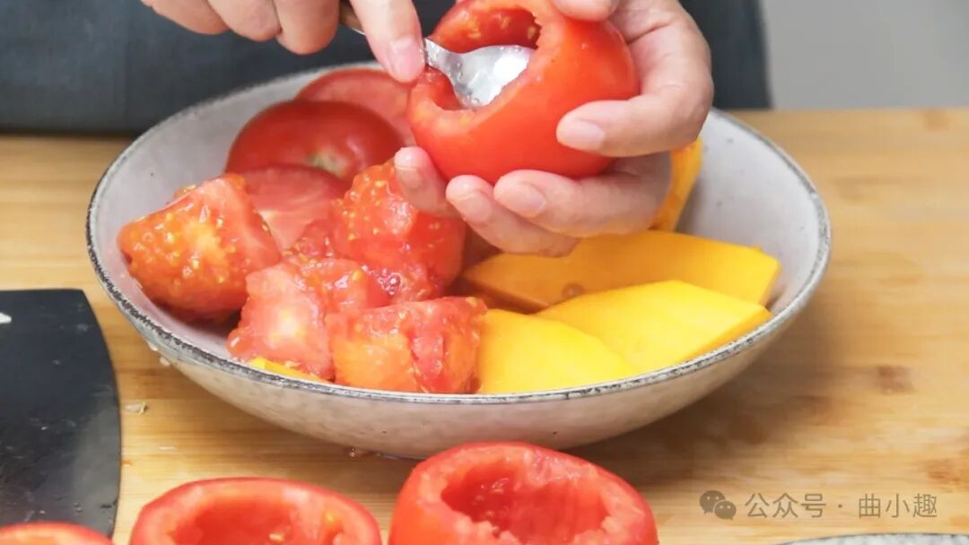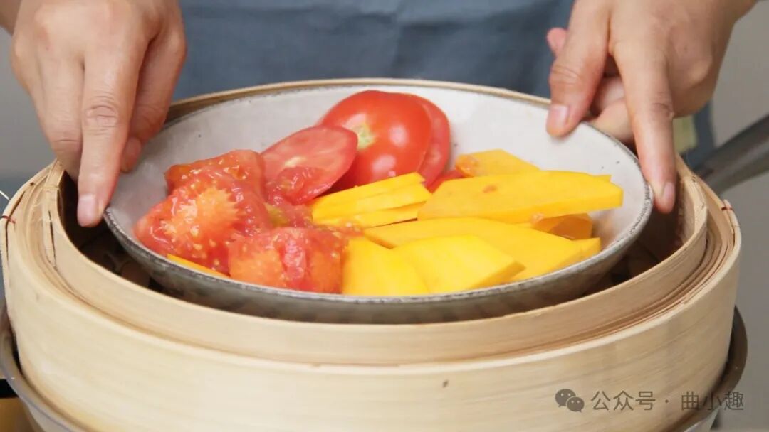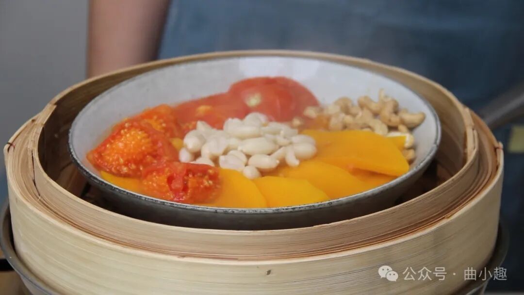 番茄切去蒂部,挖出内瓤。将挖出的番茄内瓤与切片的南瓜、腰果、花生一起蒸约15分钟至南瓜烂熟| Slice off the stem end of the tomatoes and scoop out the flesh. Steam the scooped-out tomato flesh, sliced pumpkin, cashews, and peanuts together for about 15 minutes until the pumpkin is tender